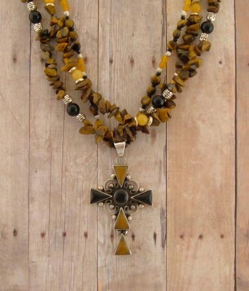 This necklace is made of Tigerseye, natural yellow honey jade, golden quarts,and black onyx gemstones accented with silver and jet seed beads. Cross pendant is onyx and old amber set in sterling silver.